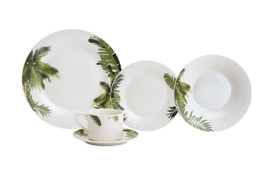 O aparelho feito em porcelana branca com estampa de folhas de coqueiro conta com 4 pratos rasos de 27cm, 4 pratos fundos de 230cm, 4 pratos para sobremesa 19cm, 4 xícaras de chá 220ml e 4 pires.