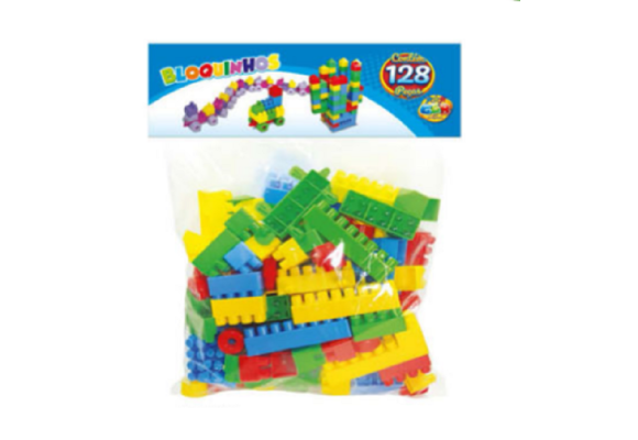 São 128 bloquinhos de montar em 4 diferentes tamanhos e nas cores azul, vermelho, verde e amarelo. Com eles suas crianças podem montar aviões, edifícios, casinhas, torres, e muitos outras coisas que vierem na imaginação