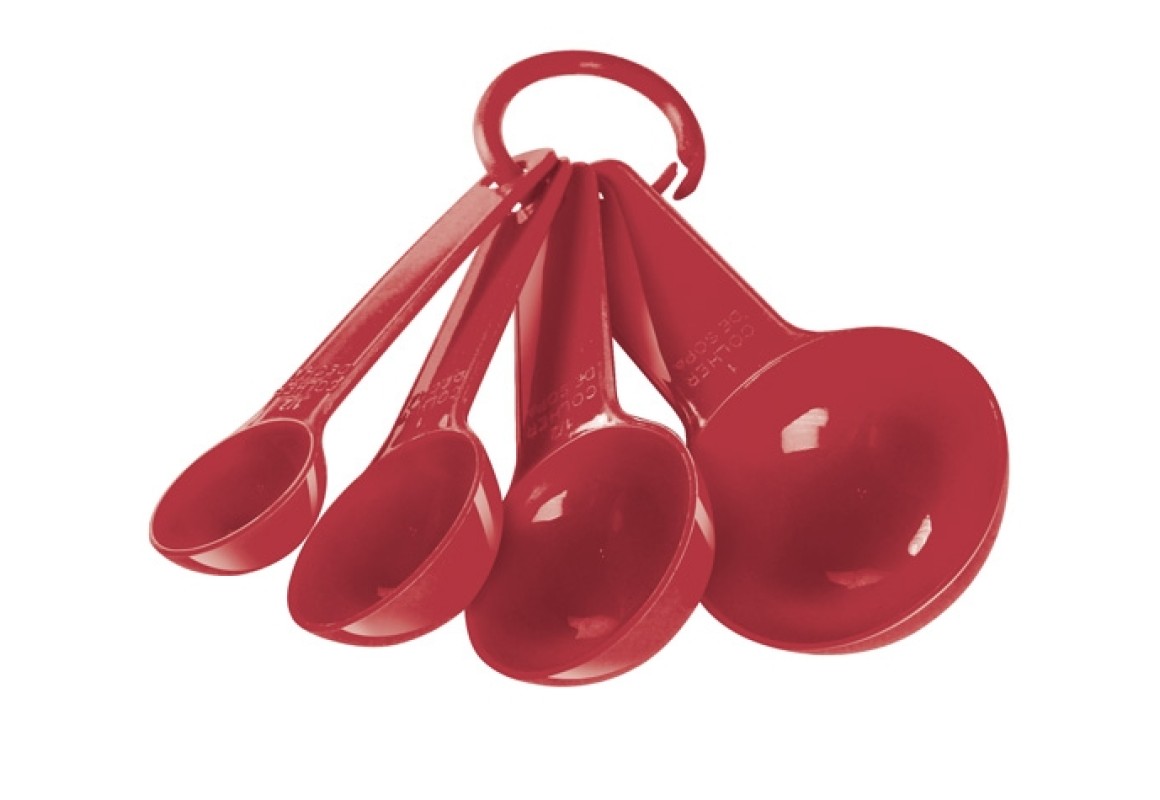 Colher medidora com 4 tamanhos sortidas, 1 e 1/2 colher de sopa e 1 e 1/2 colher de chá