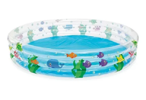 Ela conta com 3 anéis infláveis e acabamento marítimo com peixes e outros animais.
