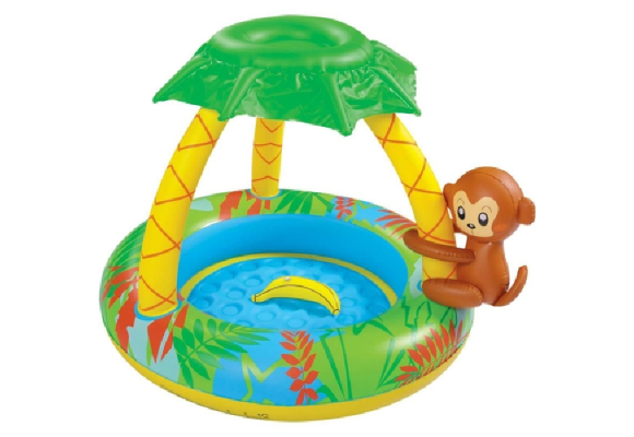 Piscina inflavel com cobertura e tema floresta. Contém um macaquinho e uma banana inflavel que podem ser utilizados como brinquedos.