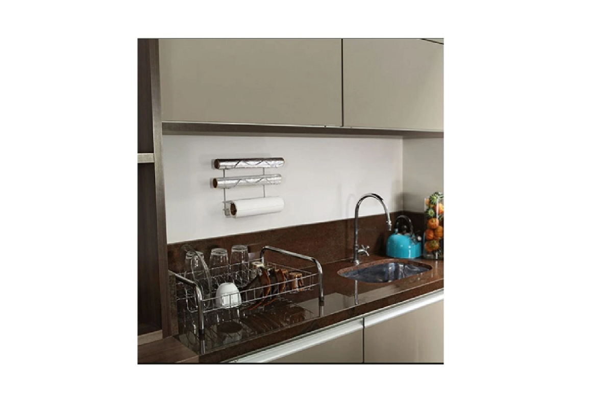 Este prático Porta Papel Toalha Alumínio Filme é fabricado em aço cromado, irá aprimorar o arranjo da sua cozinha, pois organiza 3 rolos na mesma peça, podendo ser eles rolos de papel toalha, papel alumínio e também plástico filme PVC.